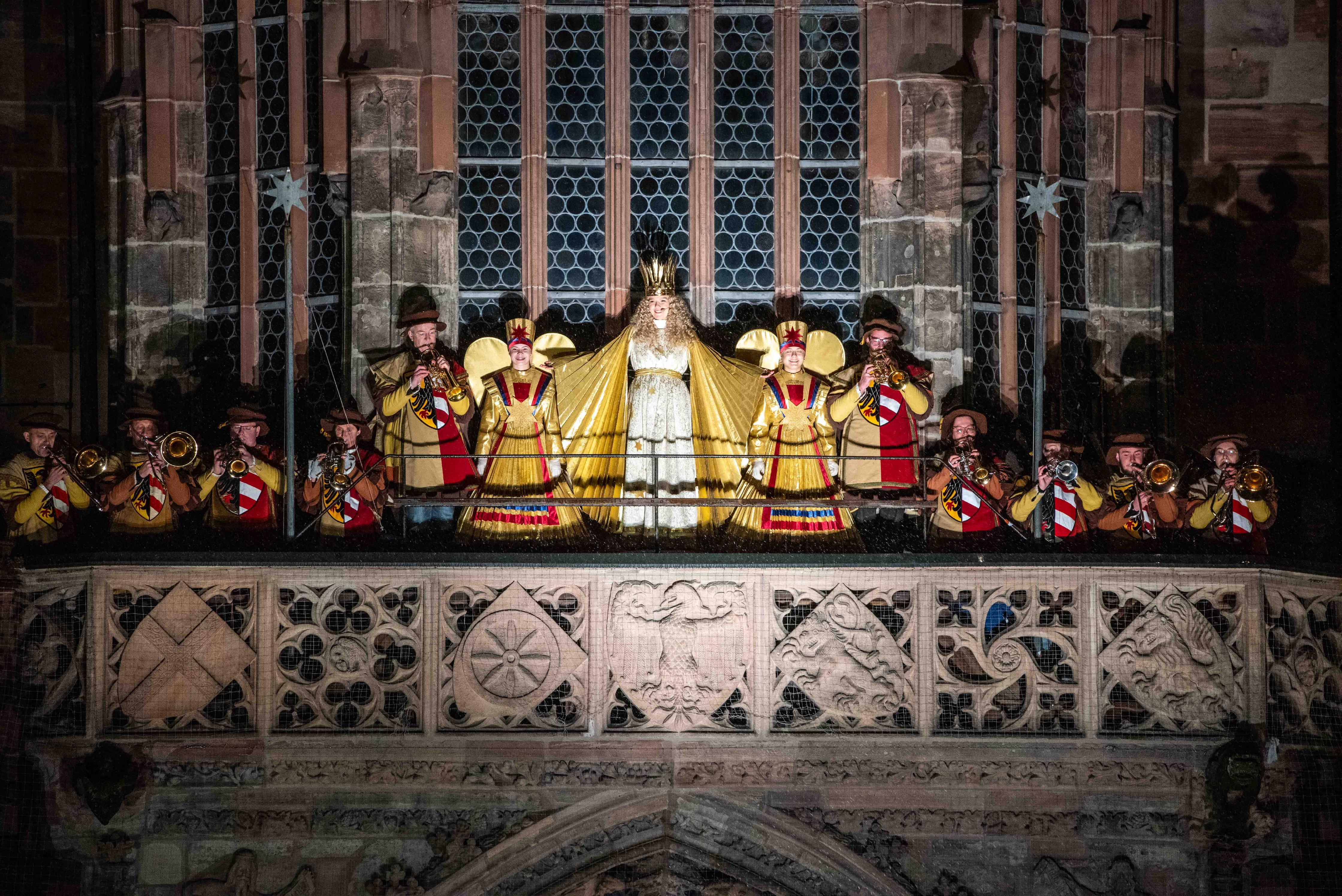 Jedes Jahr am Freitag vor dem ersten Advent ist es so weit. Pünktlich um 17.30 Uhr erlöschen rund um den Nürnberger Hauptmarkt die Lichter. Dann halten Tausende von Menschen in gespannter Erwartung den Atem an, und alle Augen richten sich auf die Empore hoch oben an der Frauenkirche.