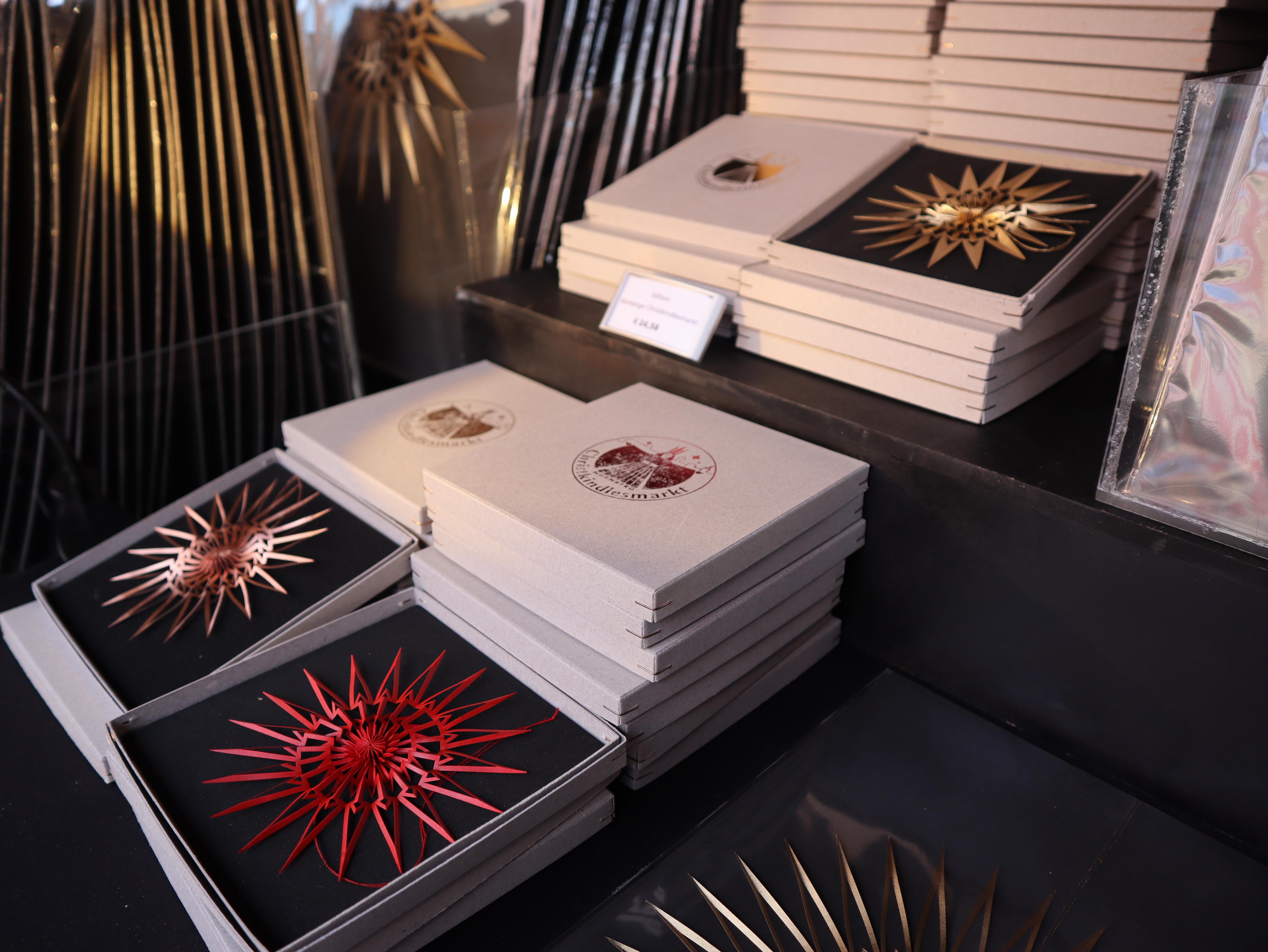 Als kleine Weihnachtsdekoration auf dem Tannenbaum oder auch in der Wohnung dienen die filigranen Papiersterne von Arndt Tennie (Bude 101). Es gibt sie in vielen verschiedenen Formen und Farben, jeder Stern ist einzigartig.