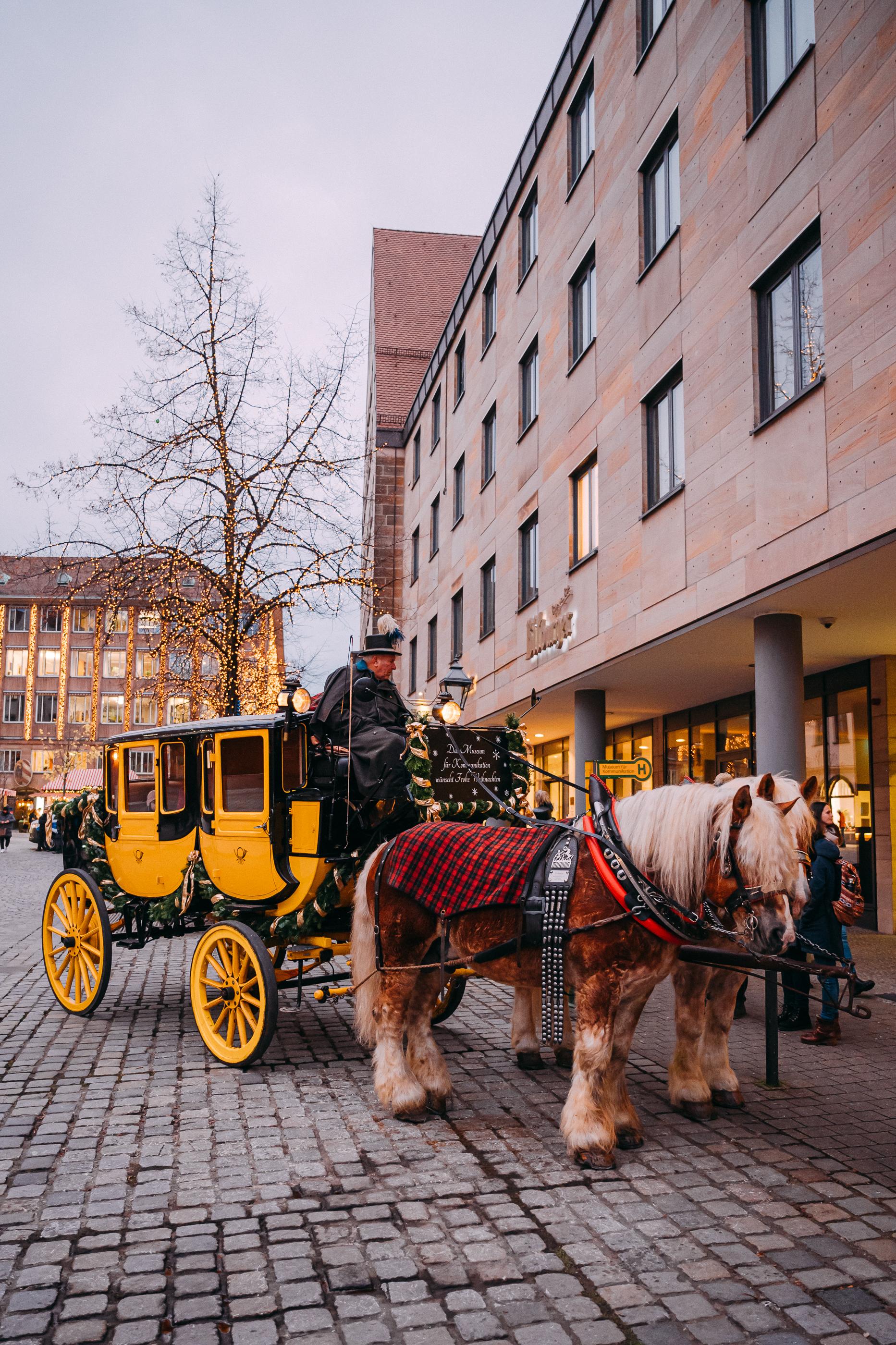 In harness stand two Rheinland Heavy Draft horses, which pull the carriage through the streets and alleys. Only very experienced horses, which have practiced in parades and are therefore used to crowds, are chosen. A total of 17 draft horses work at the Christmas Market, serving three- to four-hour shifts. As they wait for guests to board, they are protected from the cold with fluffy blankets.