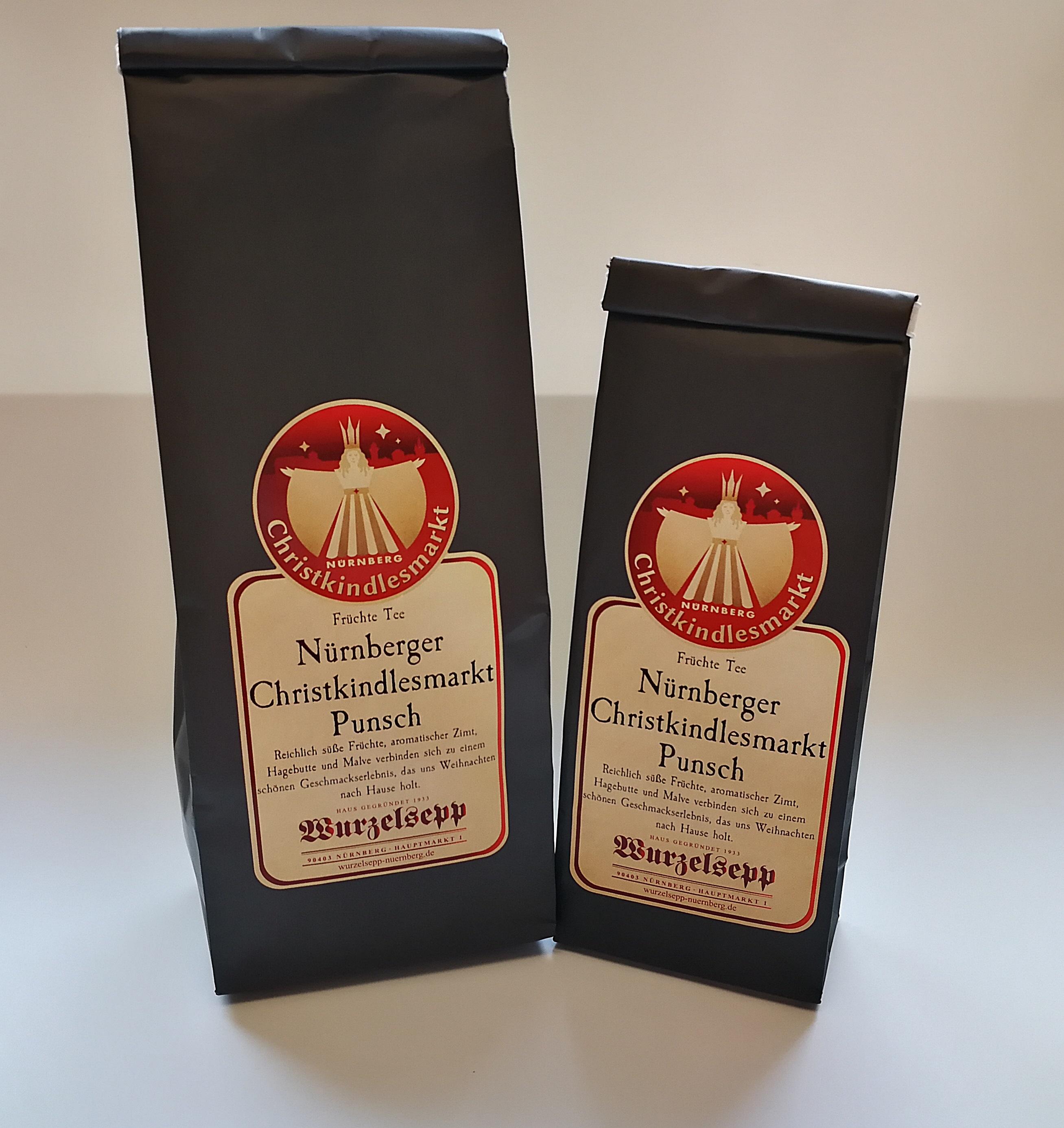 The Nuremberg Christkindlesmarkt punch from Wurzelsepp can be found at Ph. Rank. It is a tea composition which can be drunk all year long. It contains cinnamon and a wonderful mix of fruits. One can also buy it at the Wurzelsepp booth at the Christkindlesmarkt and their shop at Hauptmarkt 1. The tea is available in 100- or 250-gram packages.